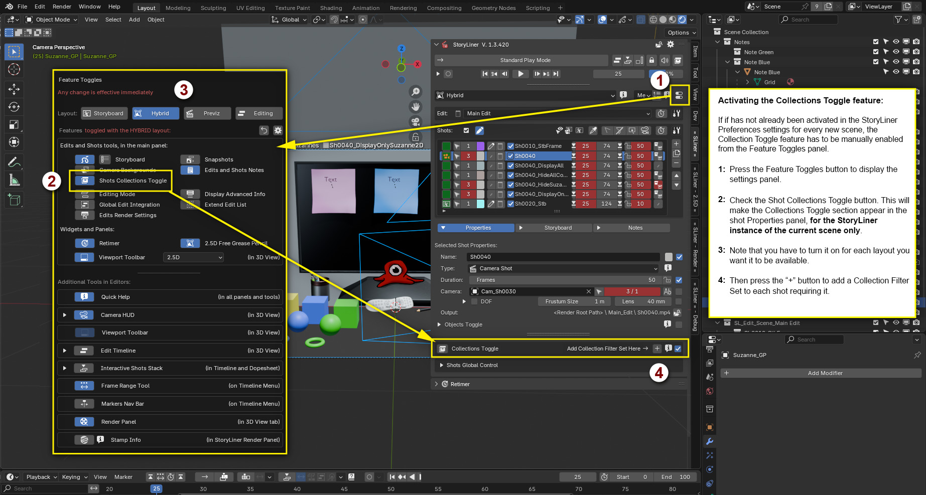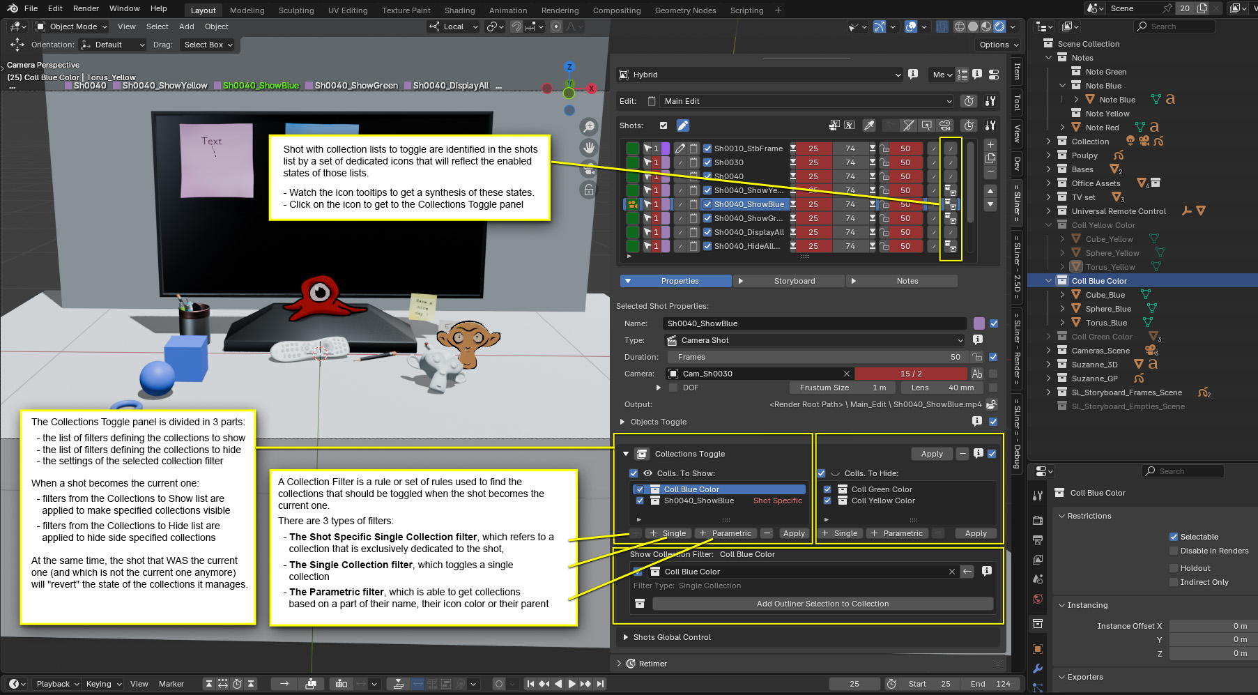 The Collections Toggle feature works very differently from the Objects Toggle one. It can become much more difficult to manage because the visibility state of collections depends not only on the visibility status set for a given shot, but also on the previous shots that were set to current, as well as on the collections that you manually enabled or disabled, on the status of their parents…