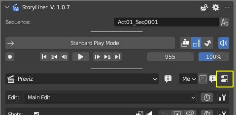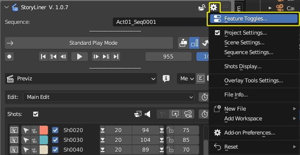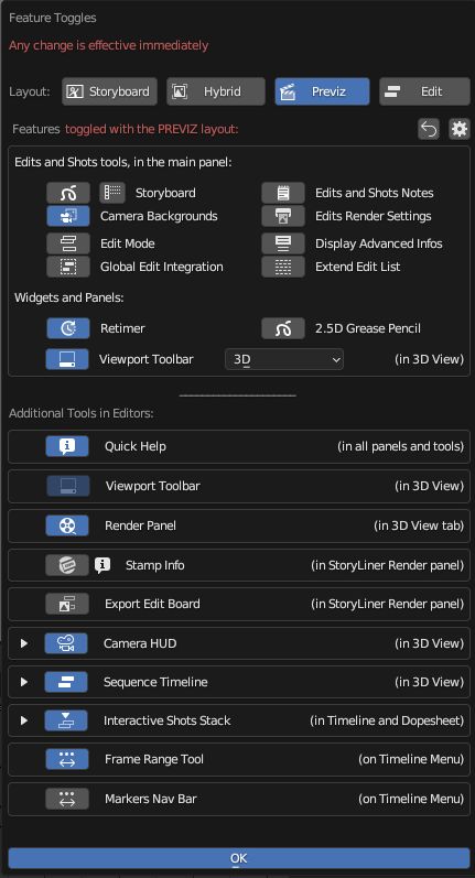 When the Features Toggle panel is opened from the StoryLiner main panel, the states of the features is defined for the layouts of the current scene. It will have to be done also for other scenes of the Blender file.